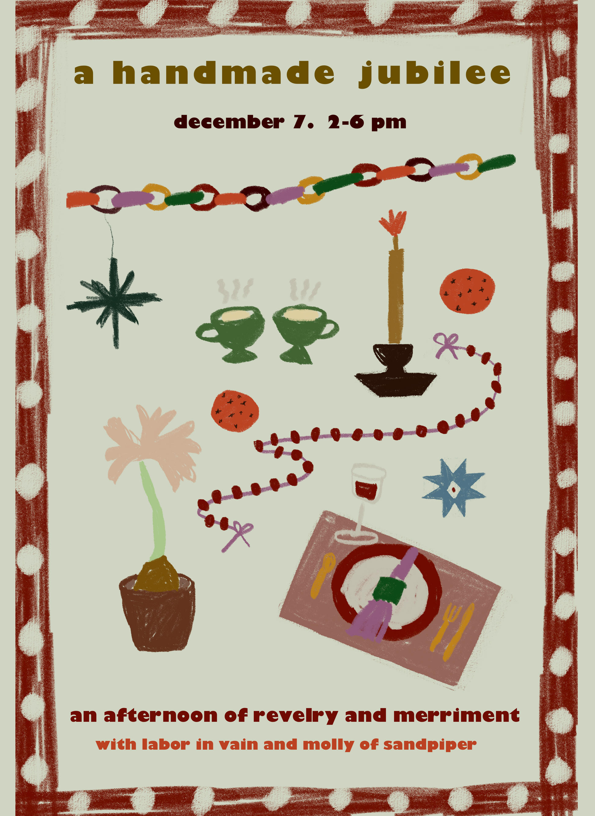 Revel in the season with us and join for an afternoon of crafts — think cranberry garlands, paperchains, pomanders, block printing — plus merriment, nibbles, and festivities brought to you in collaboration with Molly Friedman of Sandpiper Bakery, Mallie Loring Pratt, and Hanna Taylor Marino.