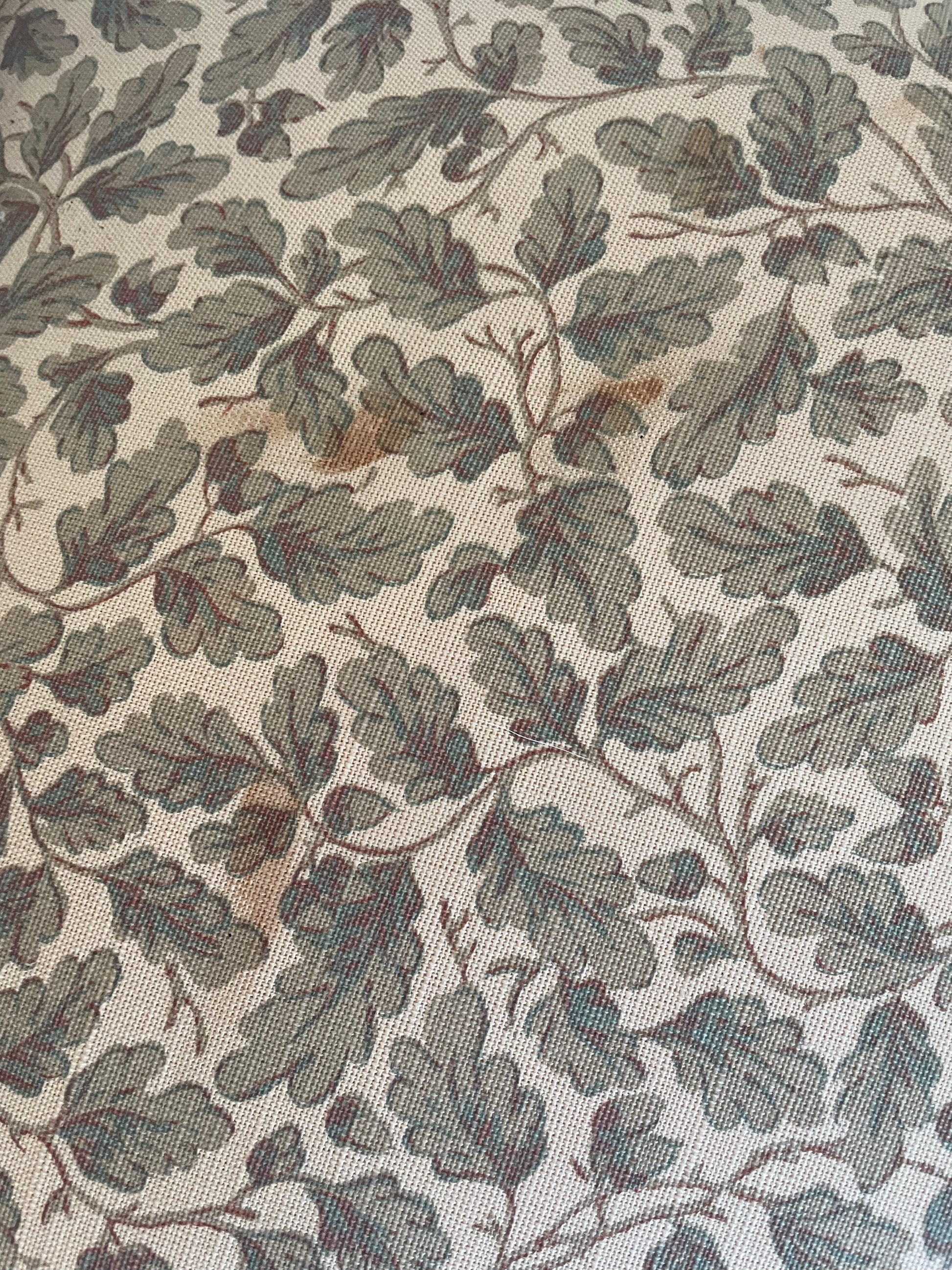 Antique slipper chair. Small spot on seat upholstery (pictured) and seat is a little squishy; otherwise in great condition and very cute. Fantastic antique casters on front feet. Perfect bedroom chair. 31” tall x 22” wide x 21” deep