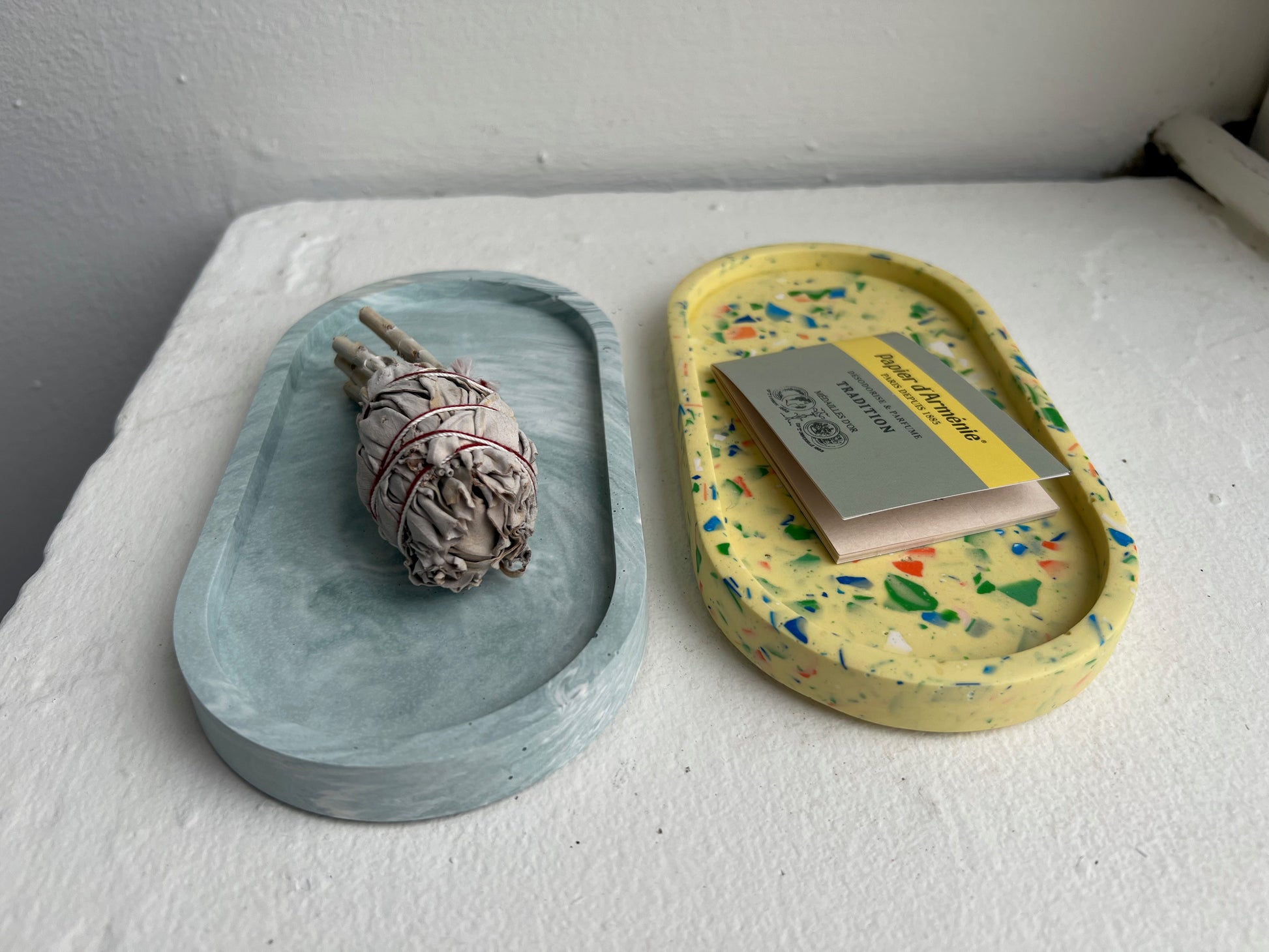 These small trays work wonders in corralling pens on your desk, for your keys by your front door, or collecting your makeup by the mirror. Made from Jesmonite eco-resin.
