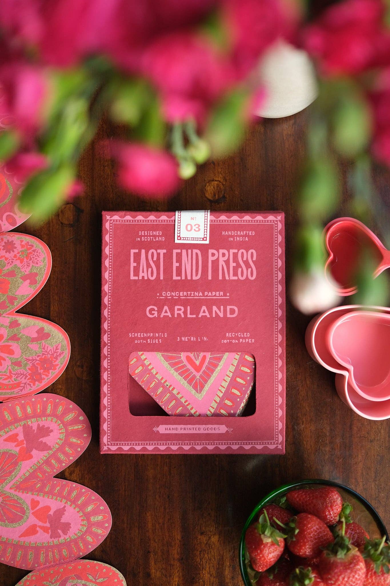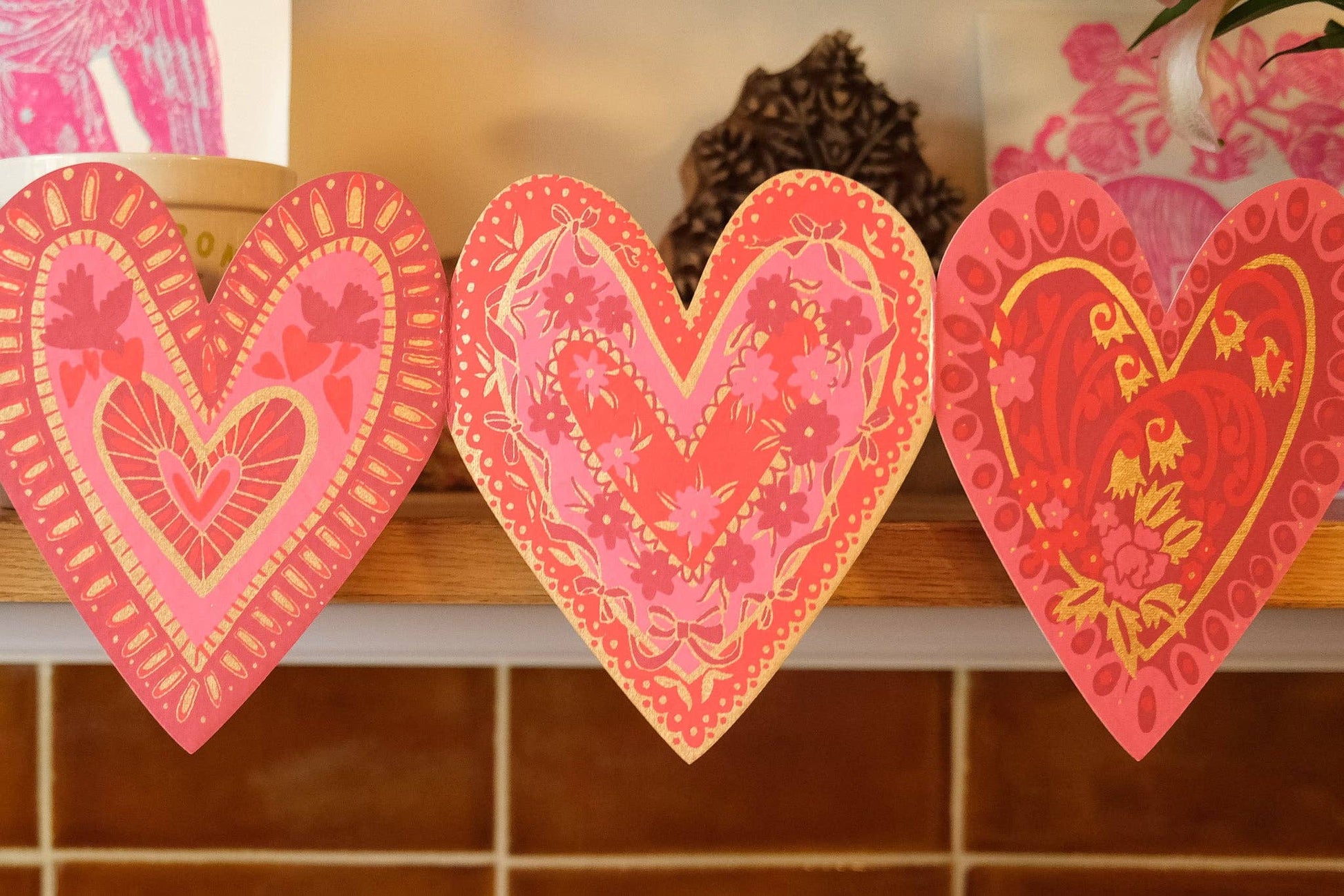 Love is in the air with our sweet collection of hearts, each adorned with bursts of pastel pink, ruby red, and flourishes of metallic gold. 3 metres long - 4 designs repeating over 20 shapes, make up each concertina. - Screen printed by hand on both sides by talented artisans in Jaipur - Sustainably made from recycled materials