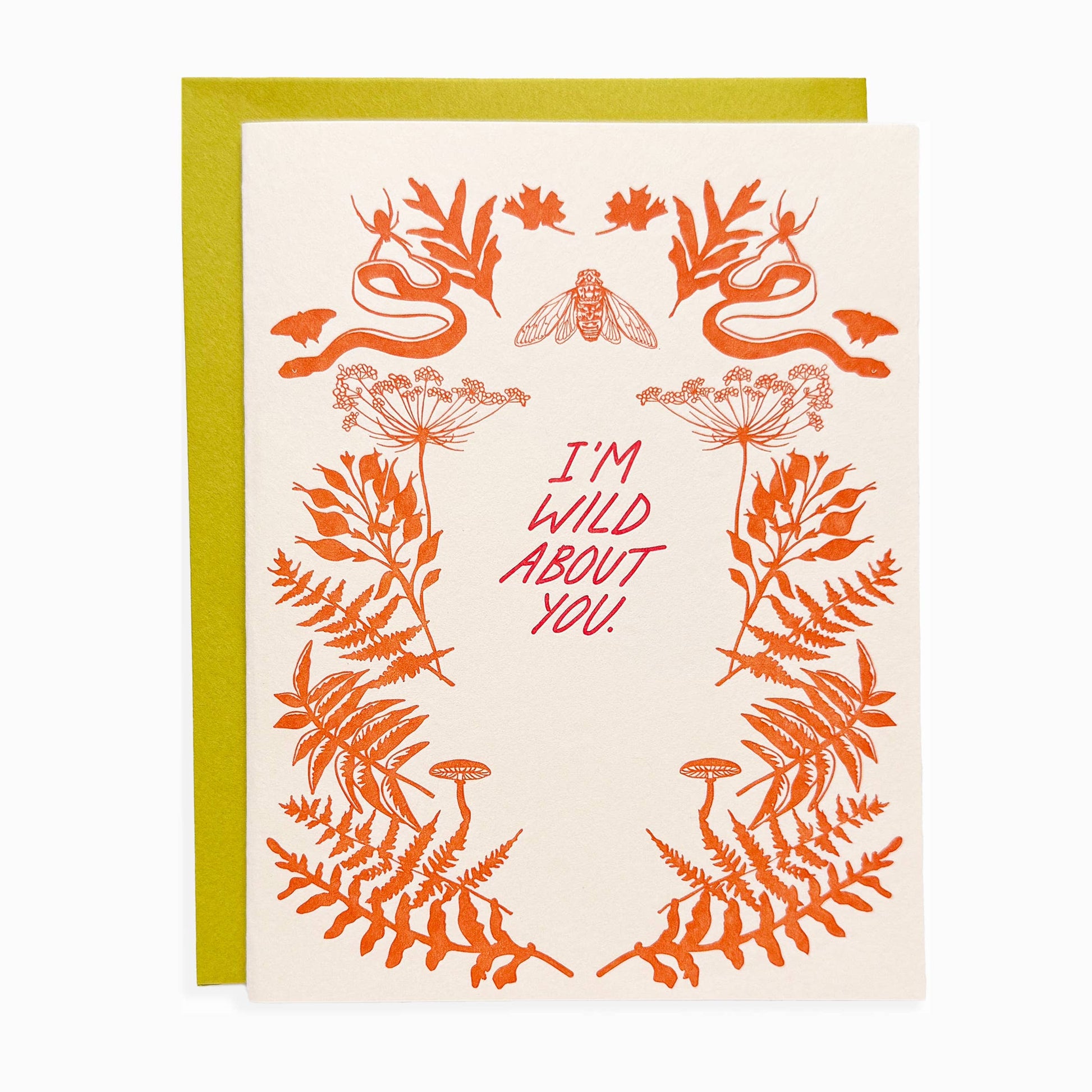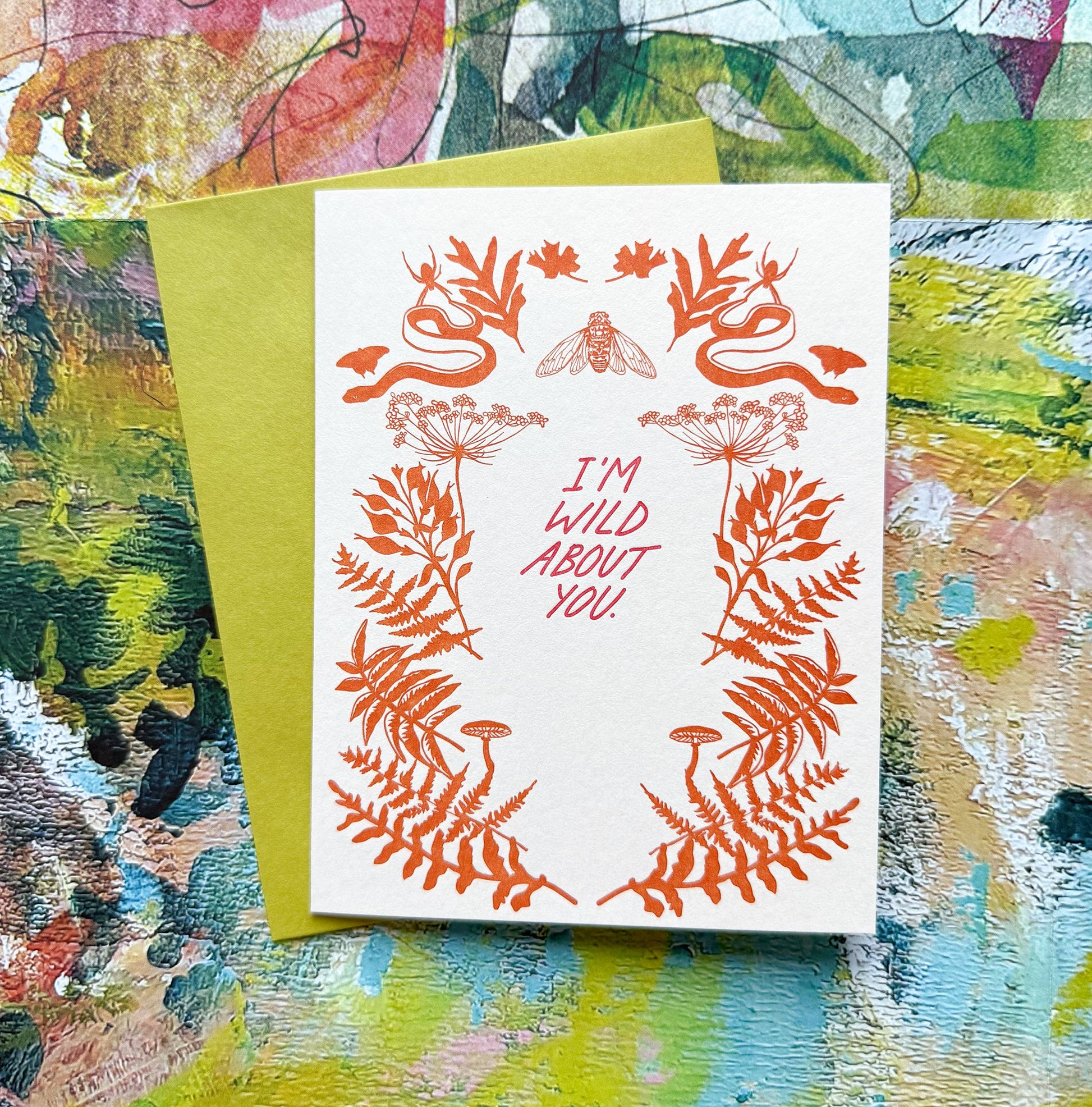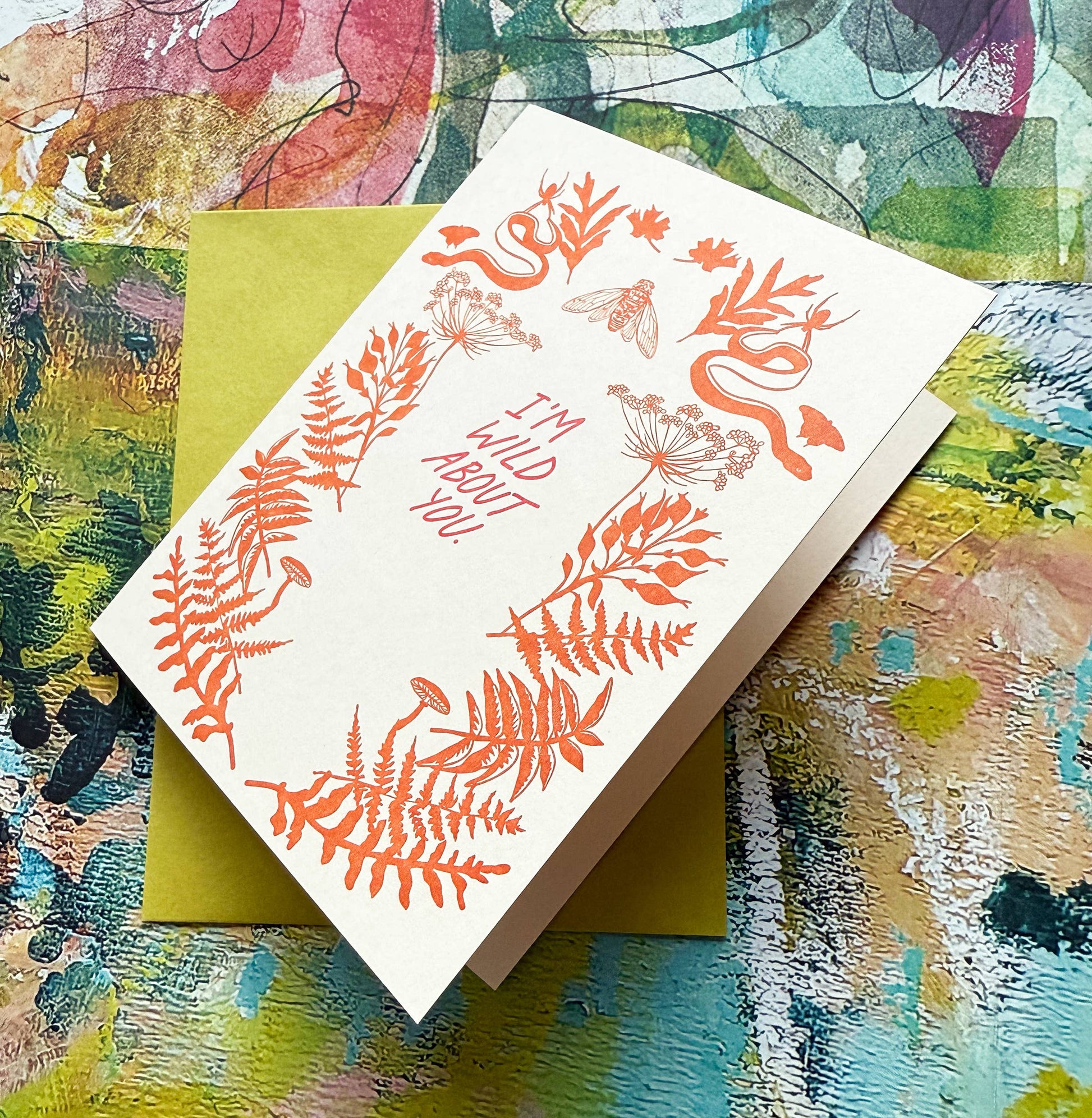 • card is letterpress printed in tangy orange and red ink on 100# blush pink paper