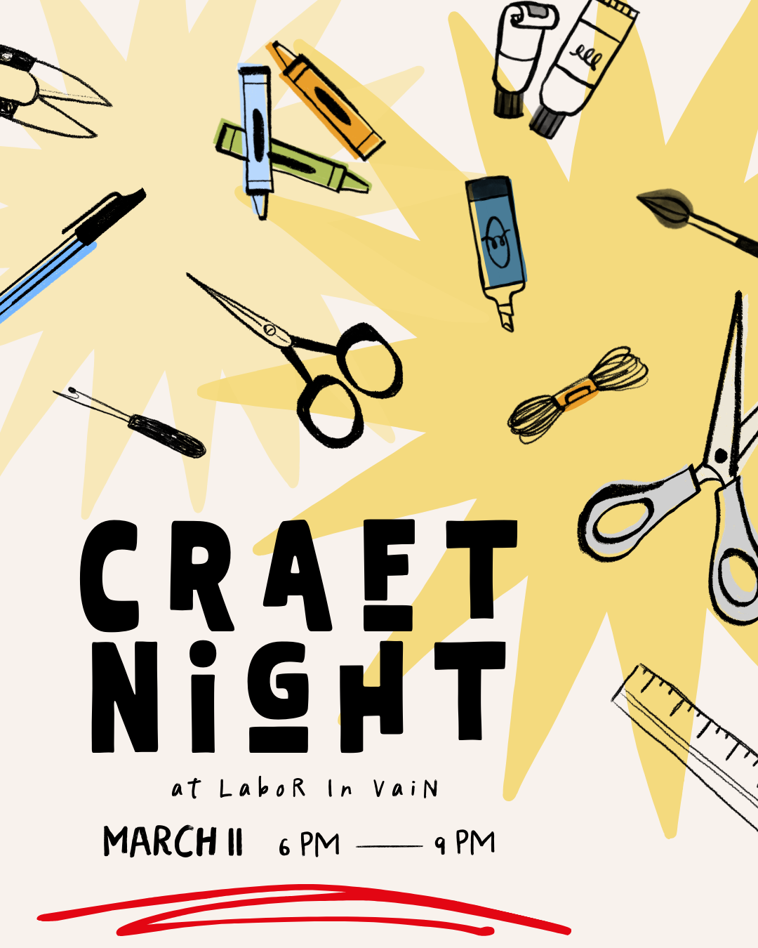 Join us for a relaxed monthly craft night to chat and create. From curious beginners to dedicated crafters, come hang out. Some ideas: mend a favorite sweater, work on your newest knitting, collage a postcard, or experiment with something entirely new while we cheer you on. Bring a project you’d like to work on, along with the supplies you’ll need for the evening. (Please note that materials should come with you—and head home with you—at the end of the night.) If you’re feeling adventurous, we’ll have some textile tools try out, including spinning, weaving, and embroidery equipment (and almost certainly some surprises, as well as snacks).
