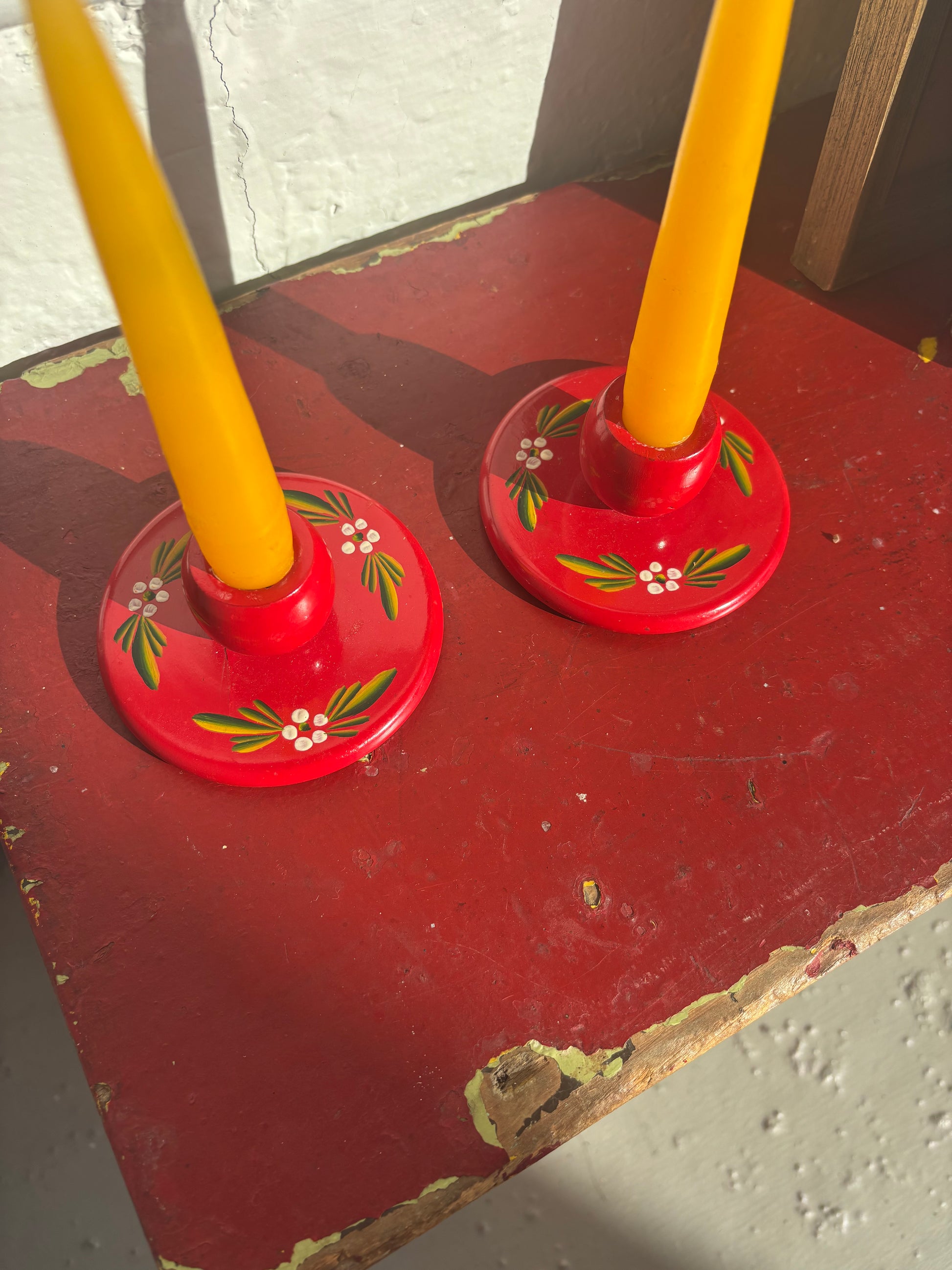 Vintage paint-decorated Scandinavian holiday wood candleholder set. Measures approximately 4” across.